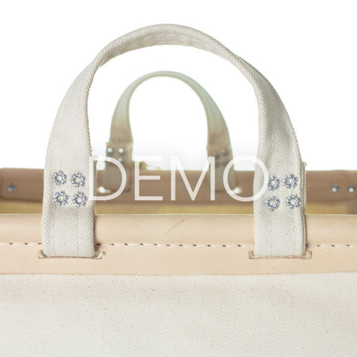 Natuurlijk hoogwaardig canvas met plantaardig gelooide leren afwerking.
